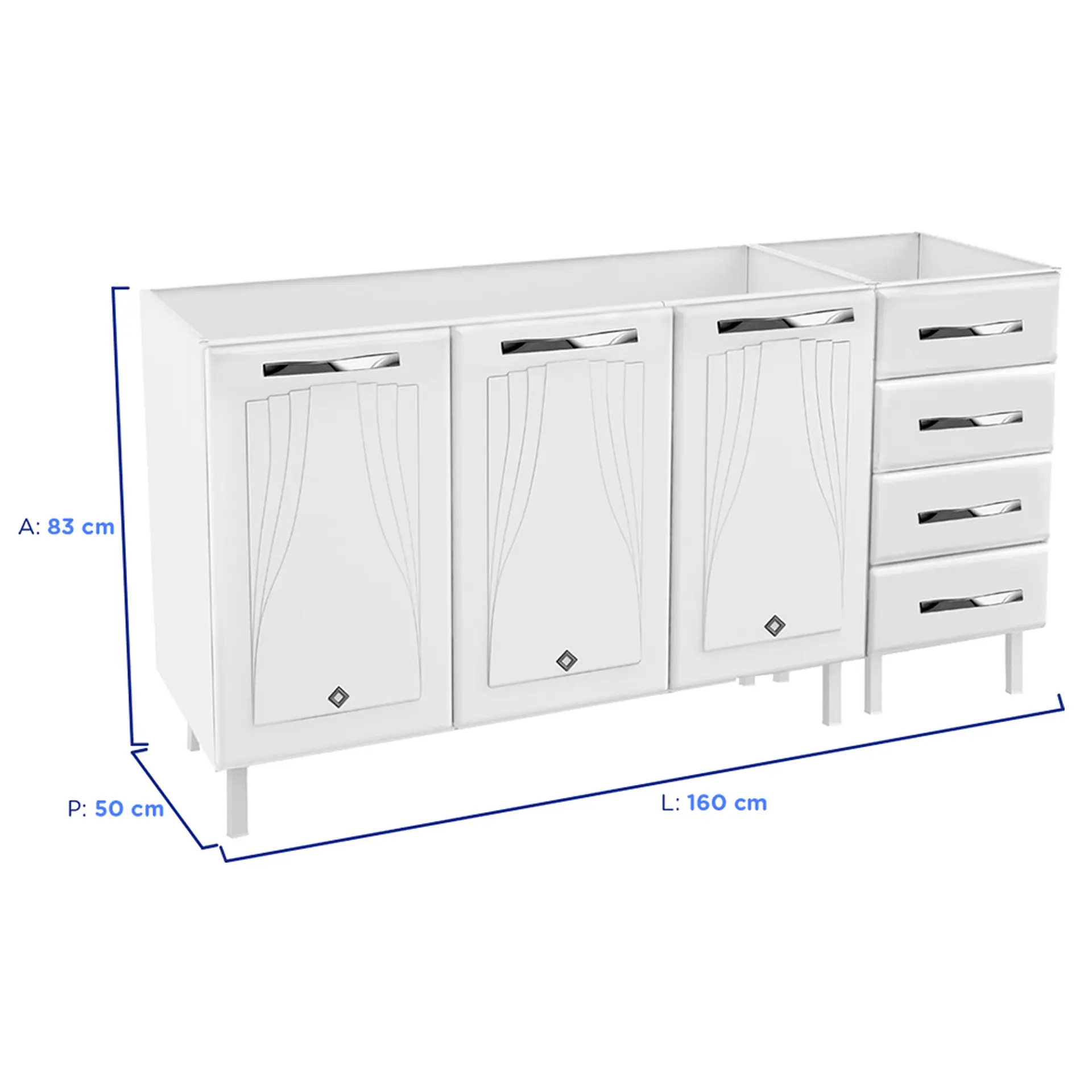 Com 3 portas e 4 gavetas, conta com amplo espaço interno para organização de suas louças, panelas e utensílios.