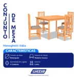 Deixe sua cozinha muito mais funcional com o Conjunto de Mesa Itália! Para proporcionar mais resistência e durabilidade, tanto a cadeira quanto a mesa são produzidas em madeira maciça de alta qualidade. Já o assento da cadeira é estofado para garantir o conforto que você e sua família merecem no momento das refeições. Confira mais detalhes: VersatilidadeUma mesa, muitas possibilidades! A mesa Itália foi projetada para ser utilizada em qualquer ambiente, seja em sua sala de jantar, na cozinha, ou até mesmo em áreas externas como varandas, edículas e onde mais preferir, inclusive em ambientes comerciais como restaurantes.DurabilidadePensando na longevidade do produto, sua mais nova mesa é fabricada em madeira maciça, com o objetivo de suportar maior carga de peso, não sofrer com alterações climáticas, ser mais duradoura, além do charme que a rusticidade proporciona. Sobre a marca: qualidade MeneghettiA Meneghetti Móveis foi fundada no ano de 1994, e vem atuando no mercado moveleiro desde então, tendo sua sede no município de Sul Brasil, oeste de Santa Catarina. A fabricação dos móveis consiste em um processo efetivo de produção, iniciando no plantio das mudas de eucalipto e seu acompanhamento até o momento de retirada. A empresa apresenta plena consciência da importância da preservação do meio ambiente para o desenvolvimento humano, buscando a conservação das riquezas presentes na região para garantir uma maior sustentabilidade e um eficiente progresso ecológico. Sua história de sucesso é construída diariamente com muita dedicação, talento e confiança de seus colaboradores e clientes, pessoas fundamentais para a sua trajetória. Hoje, com mais de 27 anos de mercado, a Meneghetti Móveis se tornou referência em seu setor, atendendo em todo o território brasileiro e realizando exportações para mais de 10 países.