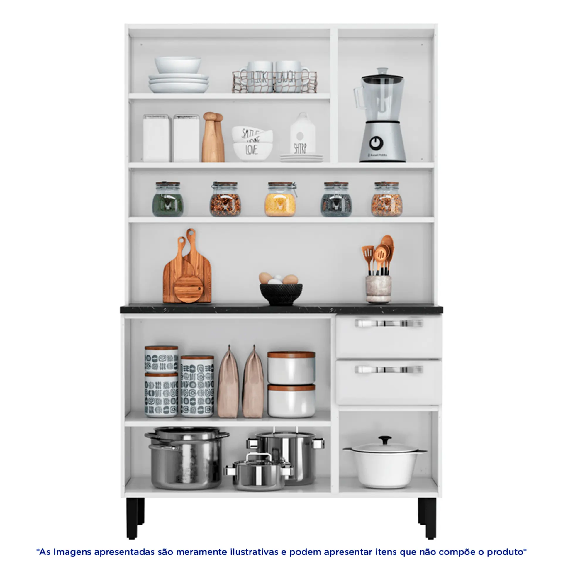 Com 6 portas e 2 gavetas, ela proporciona o armazenamento necessário para utensílios, alimentos e outros itens essenciais. O destaque fica por conta das gavetas com rediças telescópicas, que permitem uma abertura suave e silenciosa, garantindo mais conforto no uso diário. Além disso, as gavetas possuem trava de segurança, oferecendo mais estabilidade e proteção para o armazenamento.