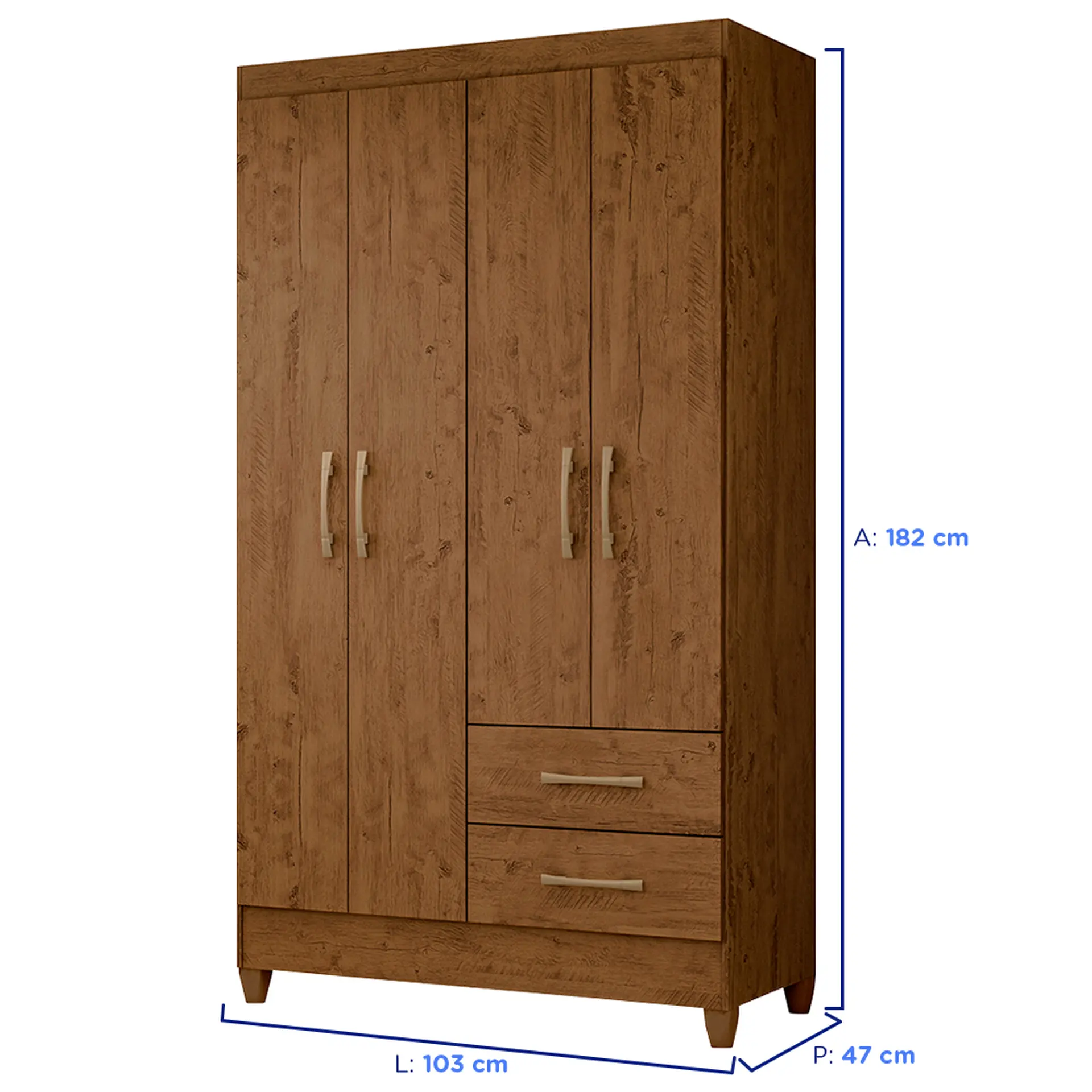 quatro portas de bater, duas gavetas com rediças metálicas, seus puxadores tem acabamentos na bronze. Ele ainda possui um cabideiro e três prateleiras internas.