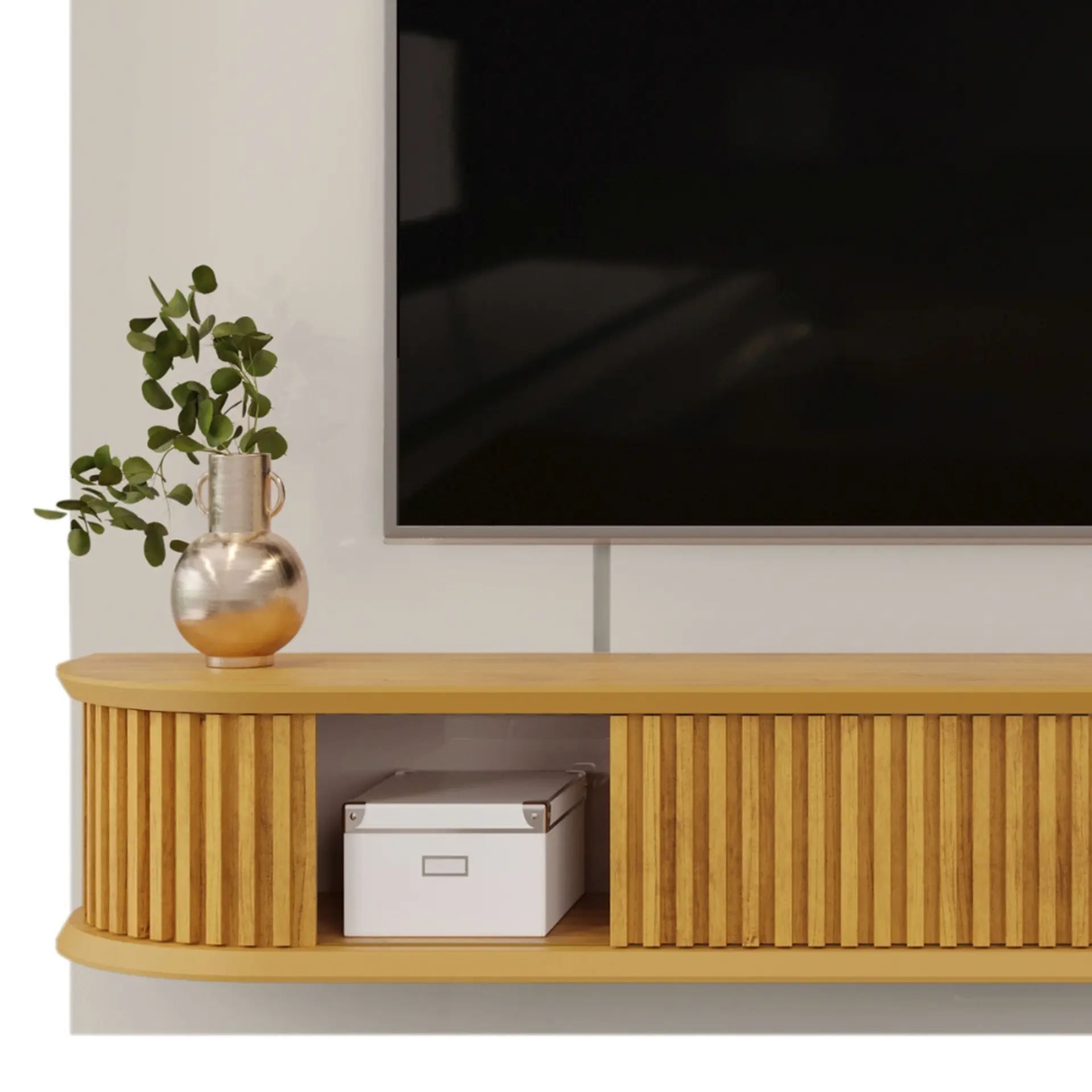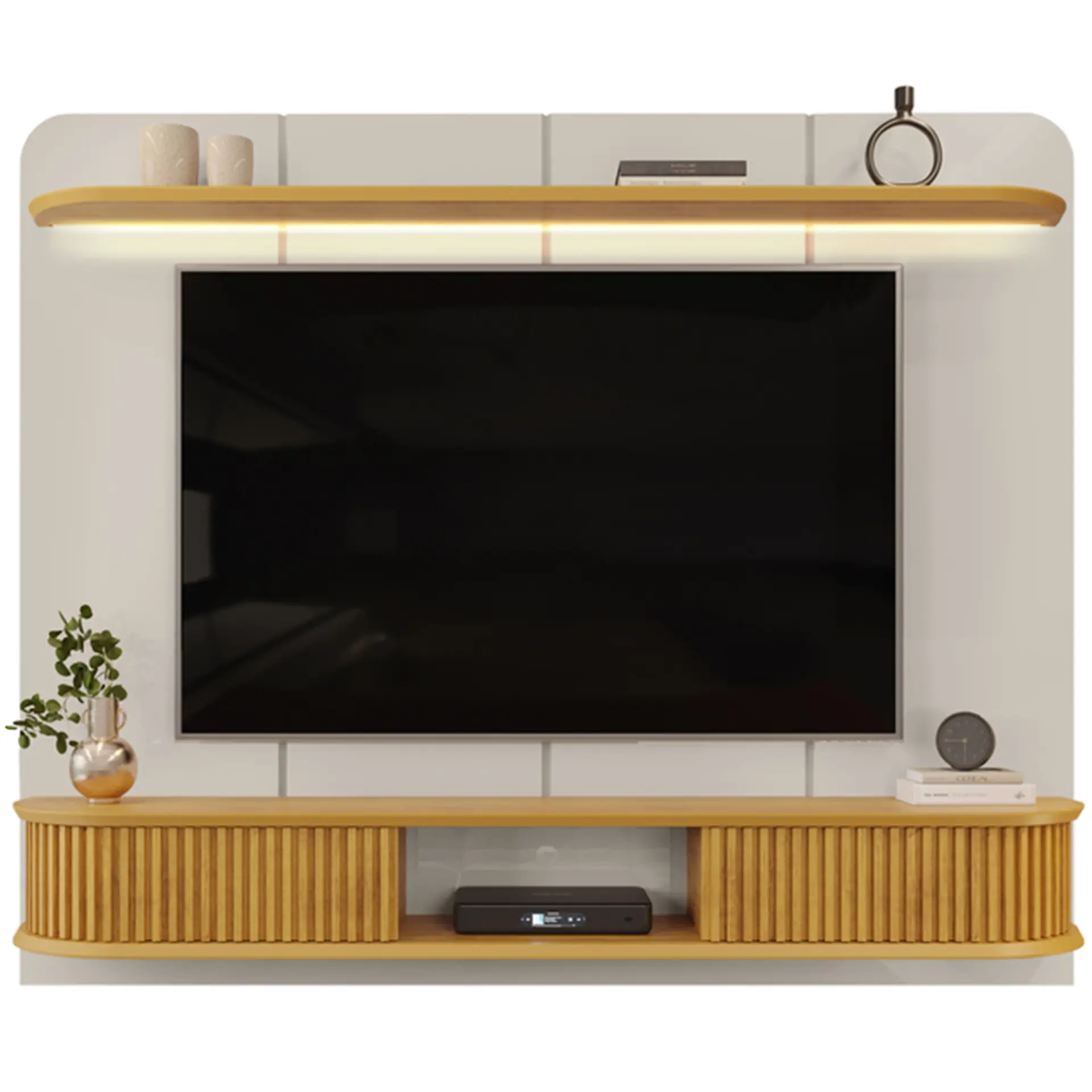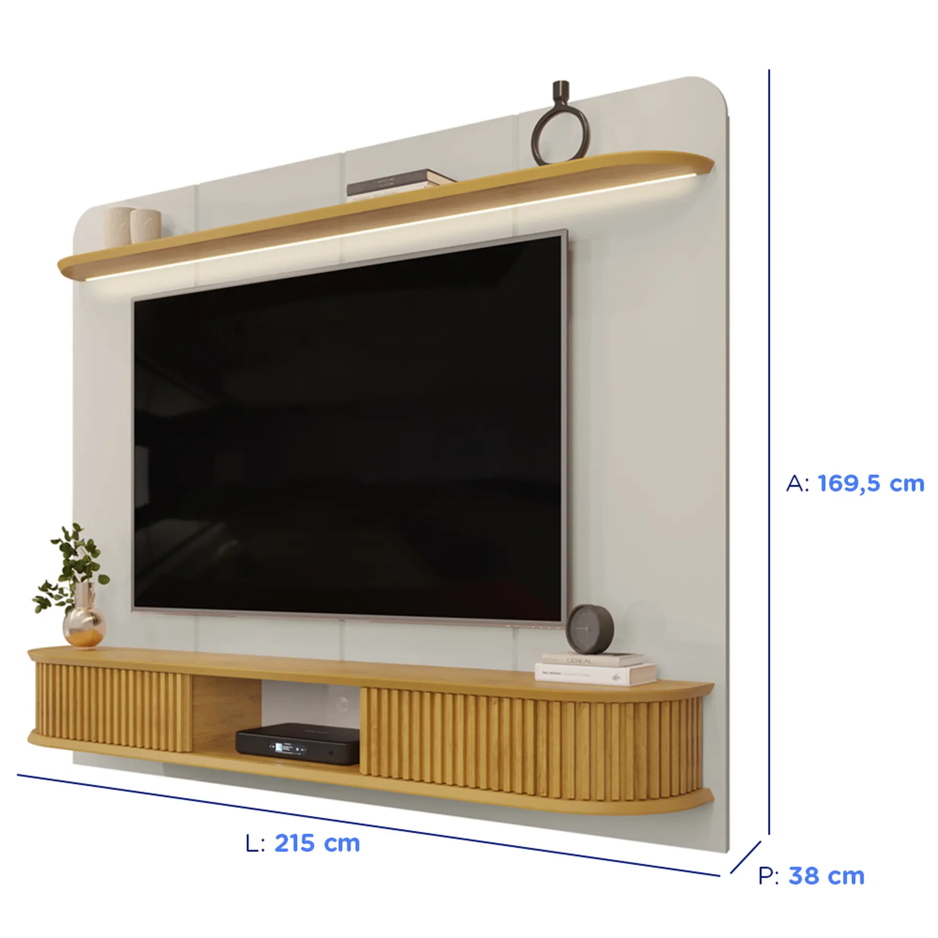O Painel DJ Móveis Capri é uma excelente escolha para quem deseja modernizar a sala de estar ou qualquer outro ambiente. Seu estilo elegante é realçado pelos cantos arredondados e pela iluminação em fita de LED na prateleira superior, que confere um toque especial e acolhedor ao ambiente. O painel acomoda TVs de até 75 polegadas e possui uma resistência de até 40 kg, assim, você pode escolher um modelo de TV ideal para complementar o espaço. Confira mais detalhes: DesignA estrutura do painel é composta por um tampo e base chanfrados, também com cantos arredondados, o que contribui para uma estética suave e fluida. As laterais, que conectam a base e o tampo, também são arredondadas, isso adiciona um visual mais sofisticado. Além disso, o painel conta com um espaço central entre as duas portas deslizantes, que são ripadas e proporcionam um detalhe extra ao design do móvel.Sobre a marca: qualidade DJ Móveis