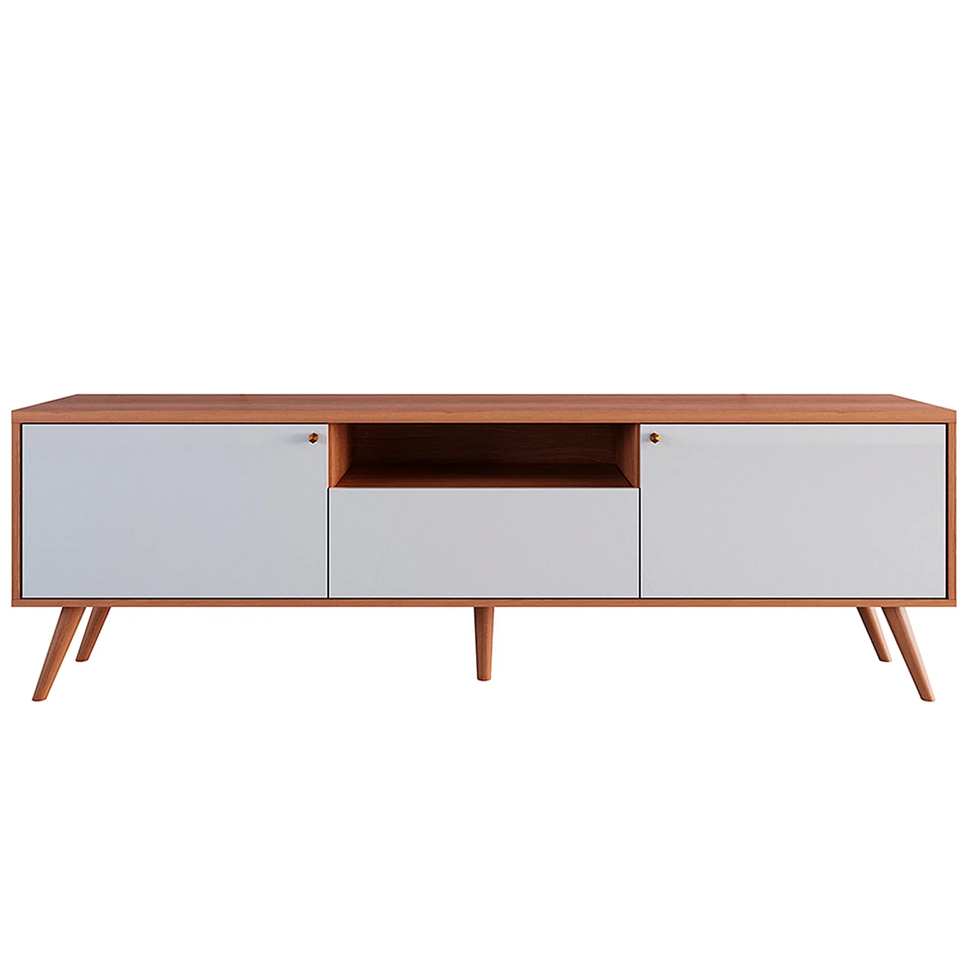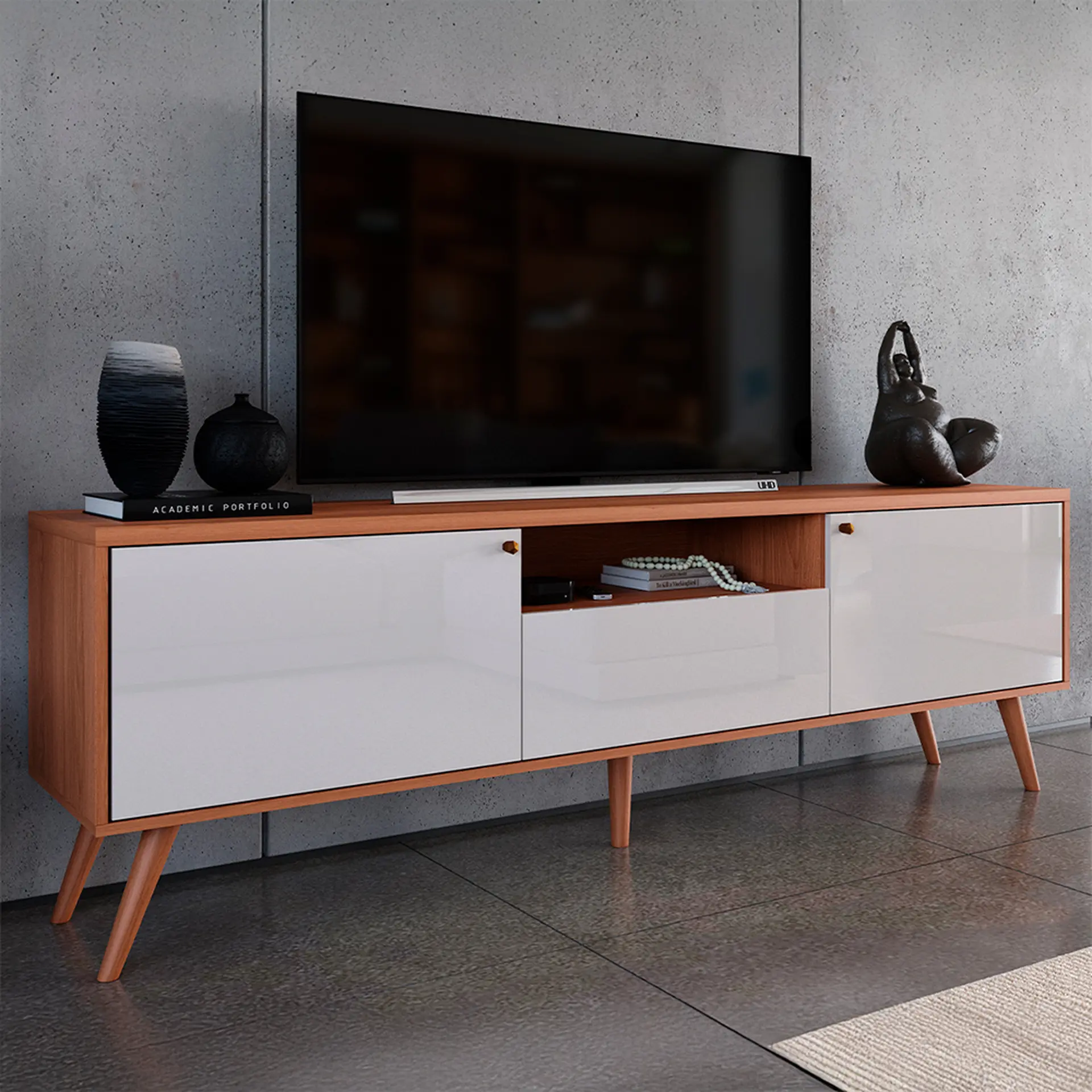 O móvel é construído com uma estrutura mista em MDF e MDP, materiais reconhecidos por sua estabilidade e resistência. Sua base é reforçada com pés de madeira maciça, que não só garantem um excelente suporte e firmeza para a peça, como também adicionam um toque de sofisticação natural ao conjunto.