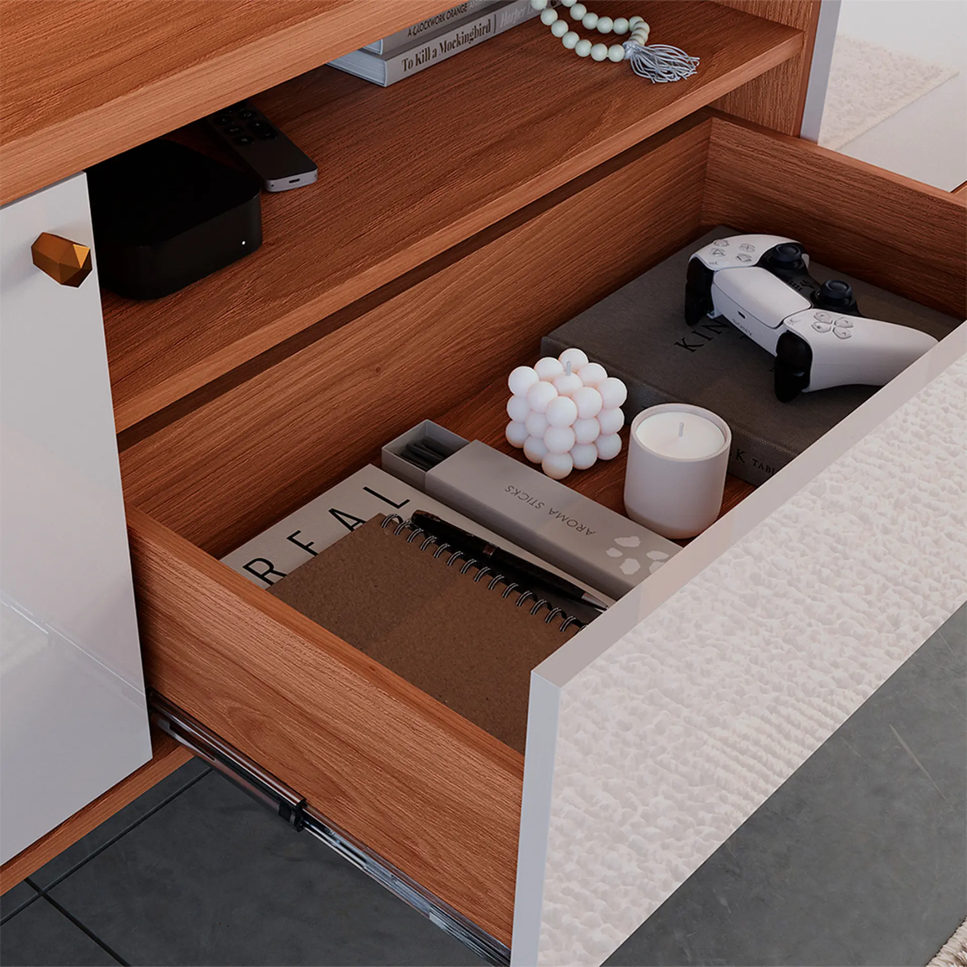 Pensando na sua rotina, o produto conta com um tampo de grande robustez, feito em MDP com 25mm de espessura, ideal para acomodar seus objetos com total segurança. A gaveta possui um sistema de rediças telescópicas, que permite a sua abertura total de forma suave e silenciosa, facilitando o acesso e a organização dos seus pertences. O acabamento fica por conta do puxador pontual em ABS, um material resistente que oferece uma pegada confortável e um visual discreto.